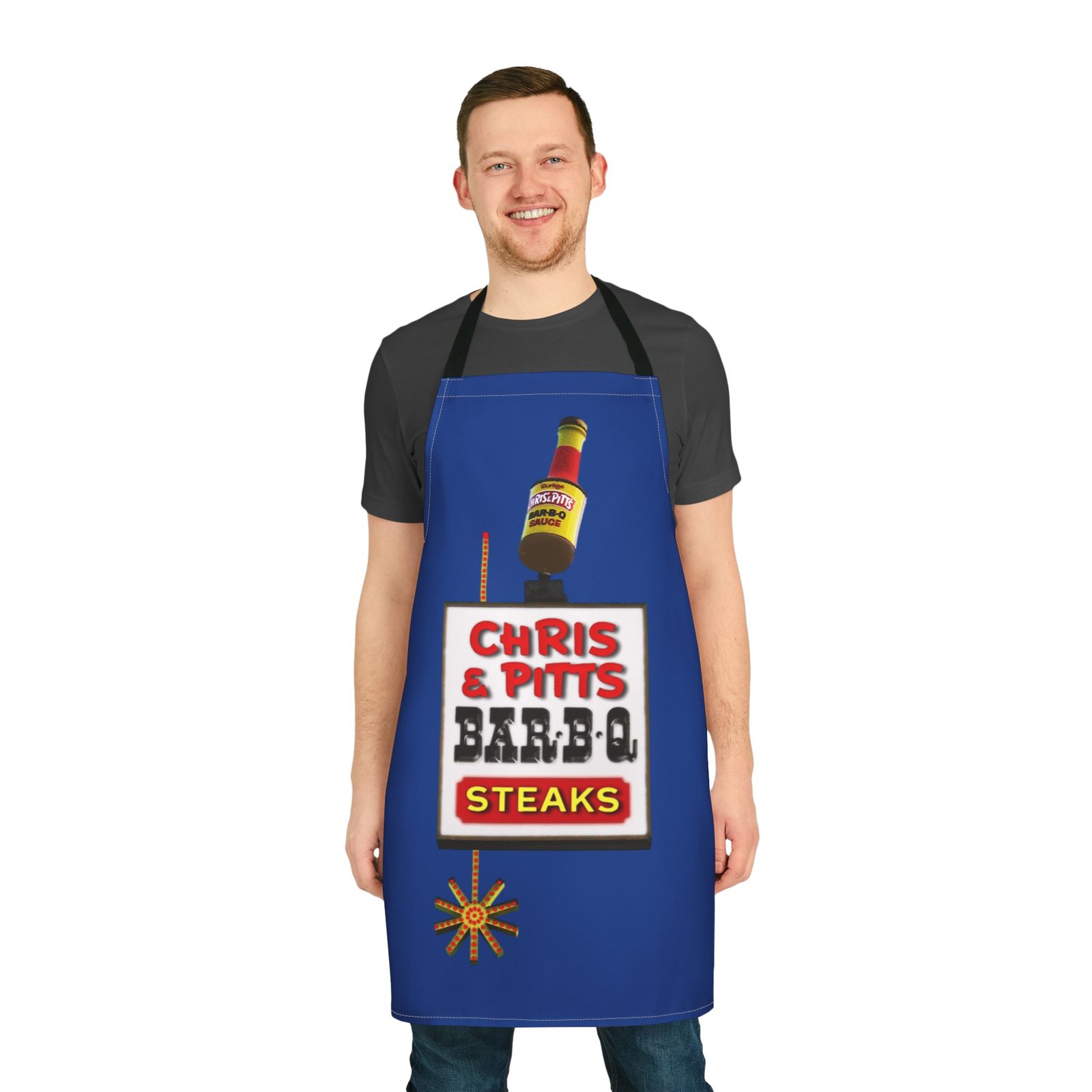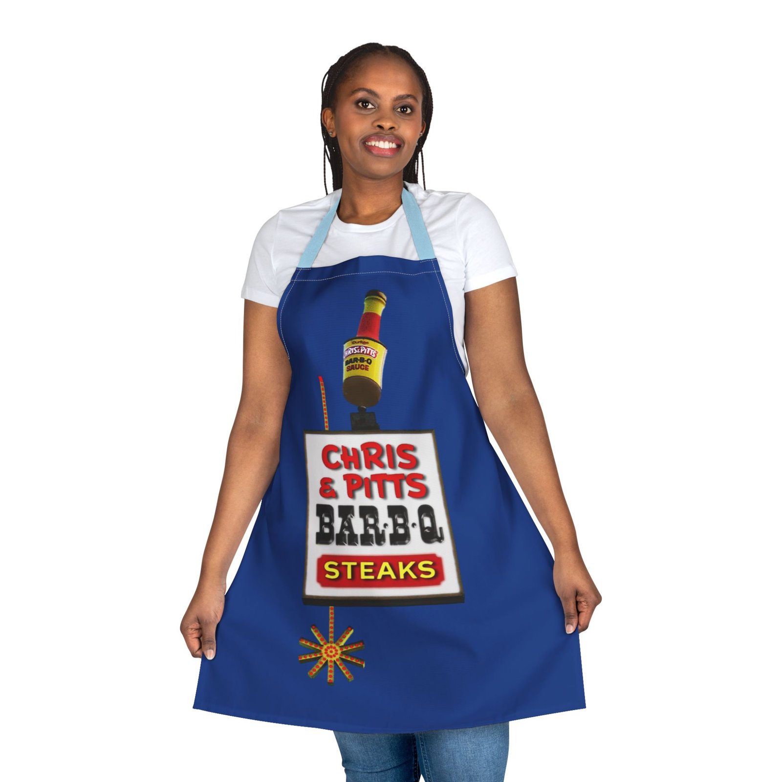 Cooking Apron: Chris and Pitts BBQ Design. This apron is perfect for BBQ enthusiasts and home cooks looking to add a pop of color to their kitchen attire. The vibrant design and comfortable fit make it ideal for holiday gatherings, summer cookouts, and everyday use in the kitchen.