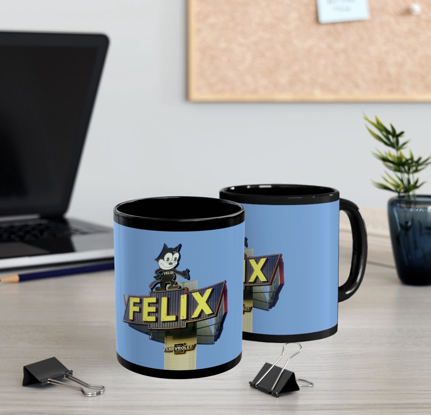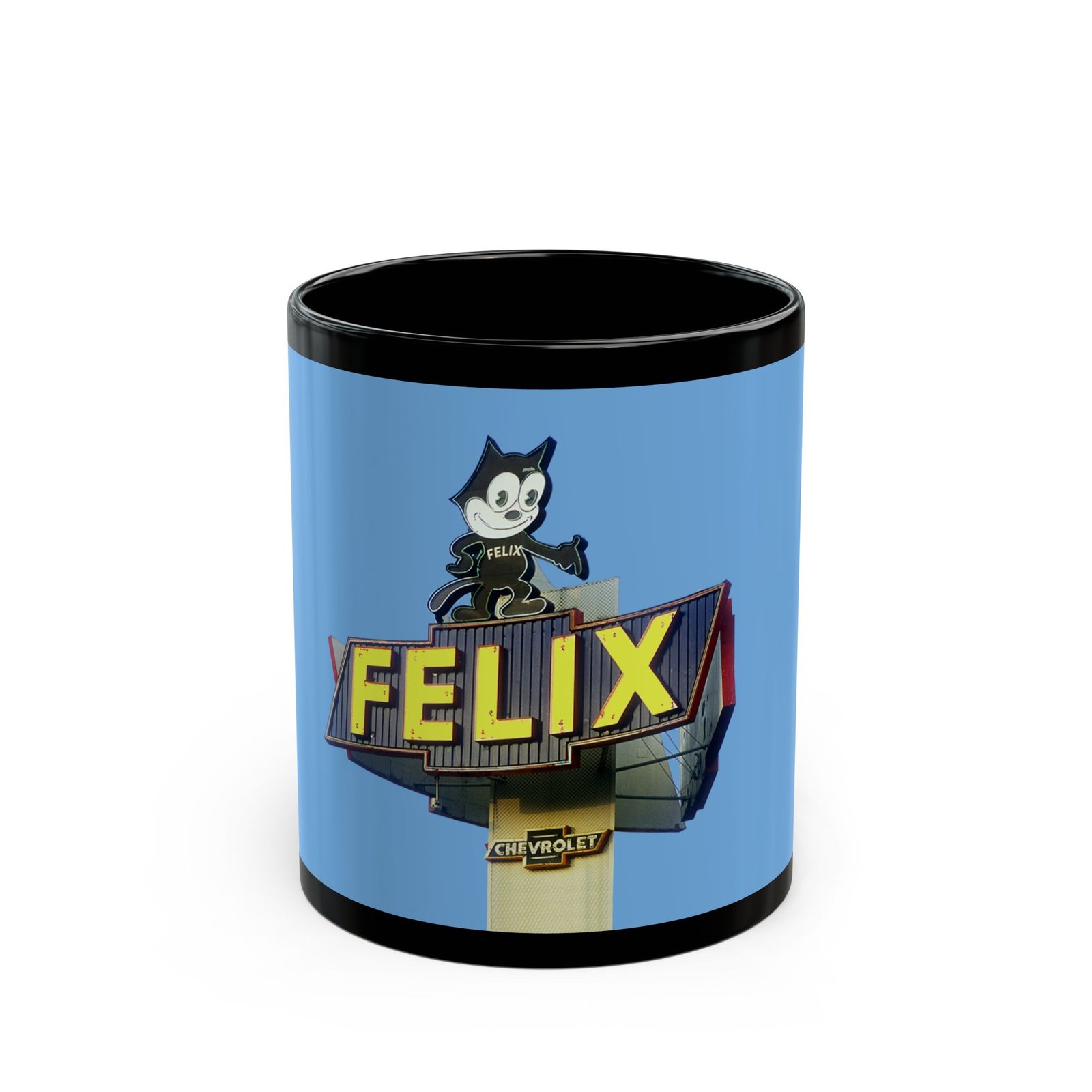 Felix the Cat Vintage Chevrolet Sign Coffee Cup. This mug embodies a retro vibe with its design, perfect for those who appreciate unique and quirky items. Ideal for coffee or tea lovers who enjoy adding a touch of vintage to their morning routine. Perfect for Halloween or any spooky-themed occasions.